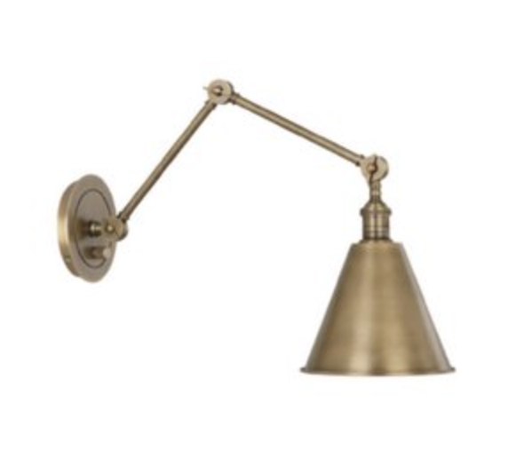 Warm Brass Sconce 13.5-17” H x 7.5” W Adjustable Wall Sconce 1 – 60W Max. Bulb Type: A Switch: Hi-Lo Dimming 24″ Cord Cover/ Direct Wire Warm Brass Finish Matching Metal Shade