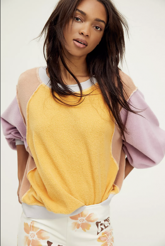 First up on the list is this lavender and yellow raw seemed, color-blocked sweatshirt from Free People. Pair it with a bias cut skirt and a super cute pair of tennis shoes and you’re ready for fun!