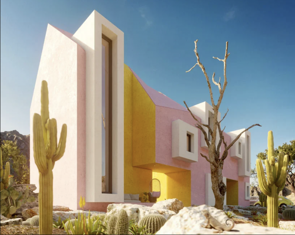 Moscow meets Mexico. Existing only in the digital landscape, this vibrant, virtual art Village is a fantastical play of bold colors and bold shapes. Nestled along colossal computer cacti, I could virtually vacay here for days. Check out the other works from the design duo, Davit and Mary Jalavyan.