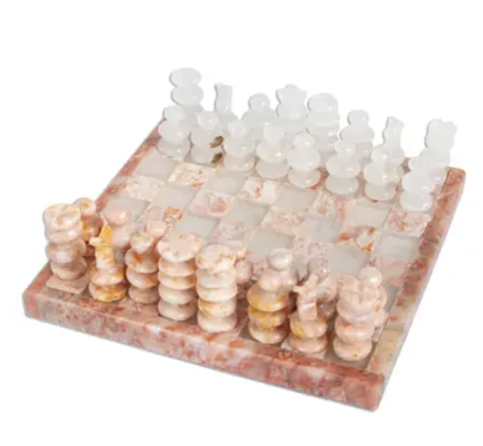 And because we love options, we’re showing another sculpturally inspired chess set made from rose and white Onyx and Marble and so well-priced. Usually white has the opening advantage in the game of chess, but my feelings would not be hurt at all if I drew rose. I’m looking at this one for a Christmas gift to my family now.